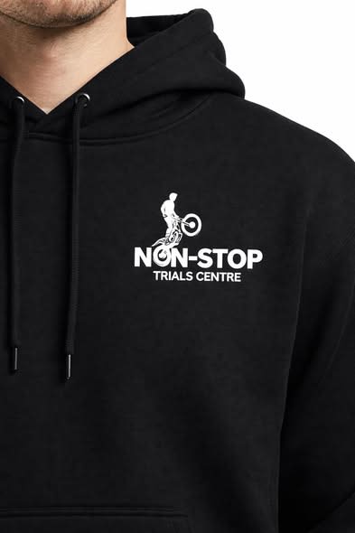 Good quality black hoodie with Non Stop Trials Logo, generous sizes.